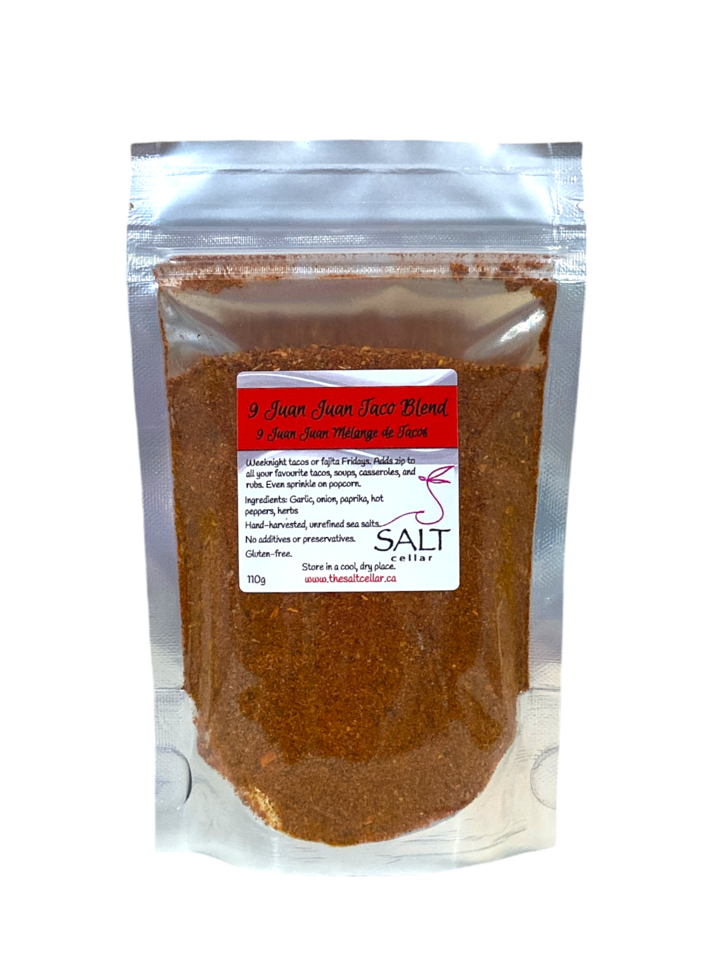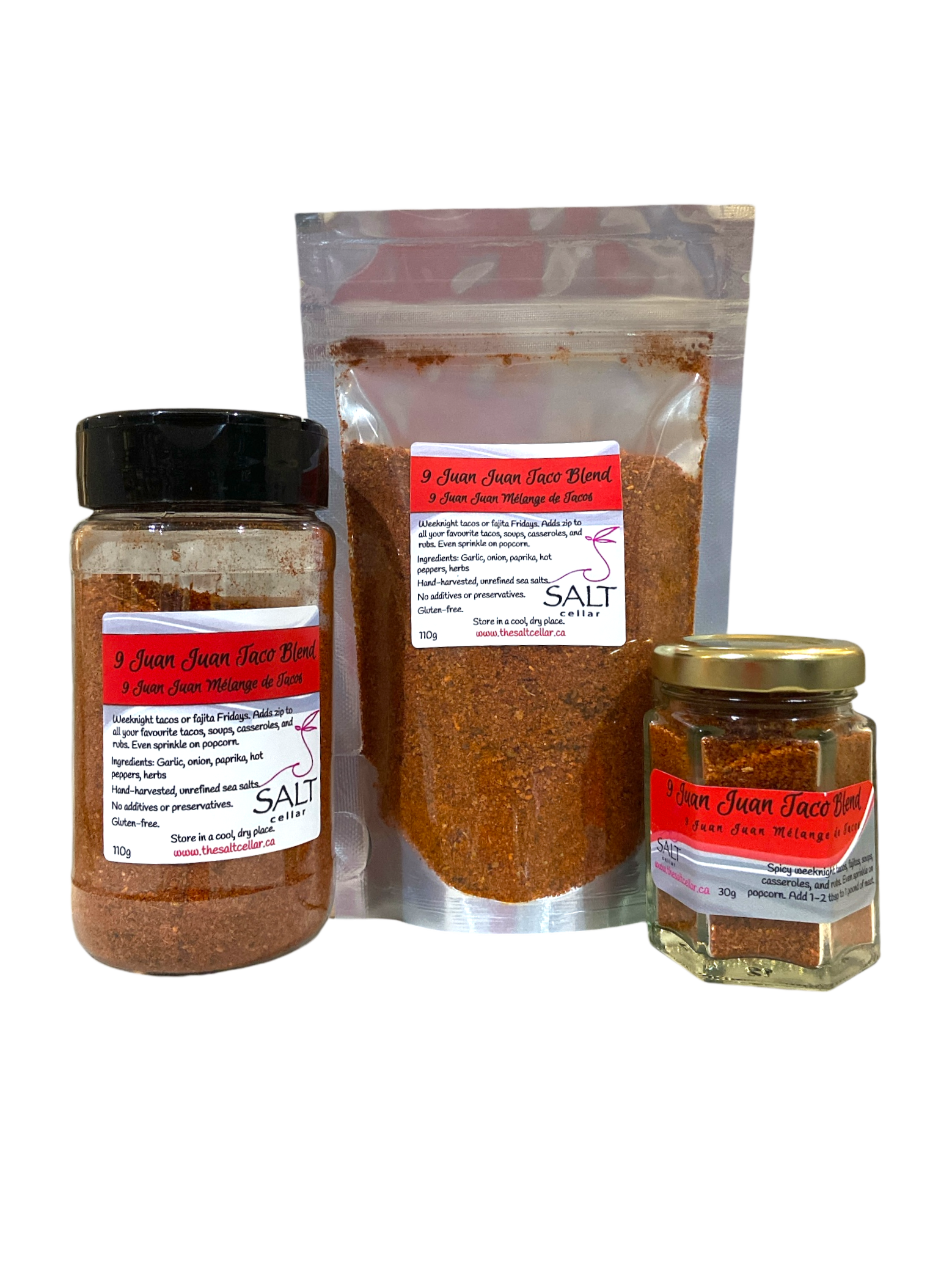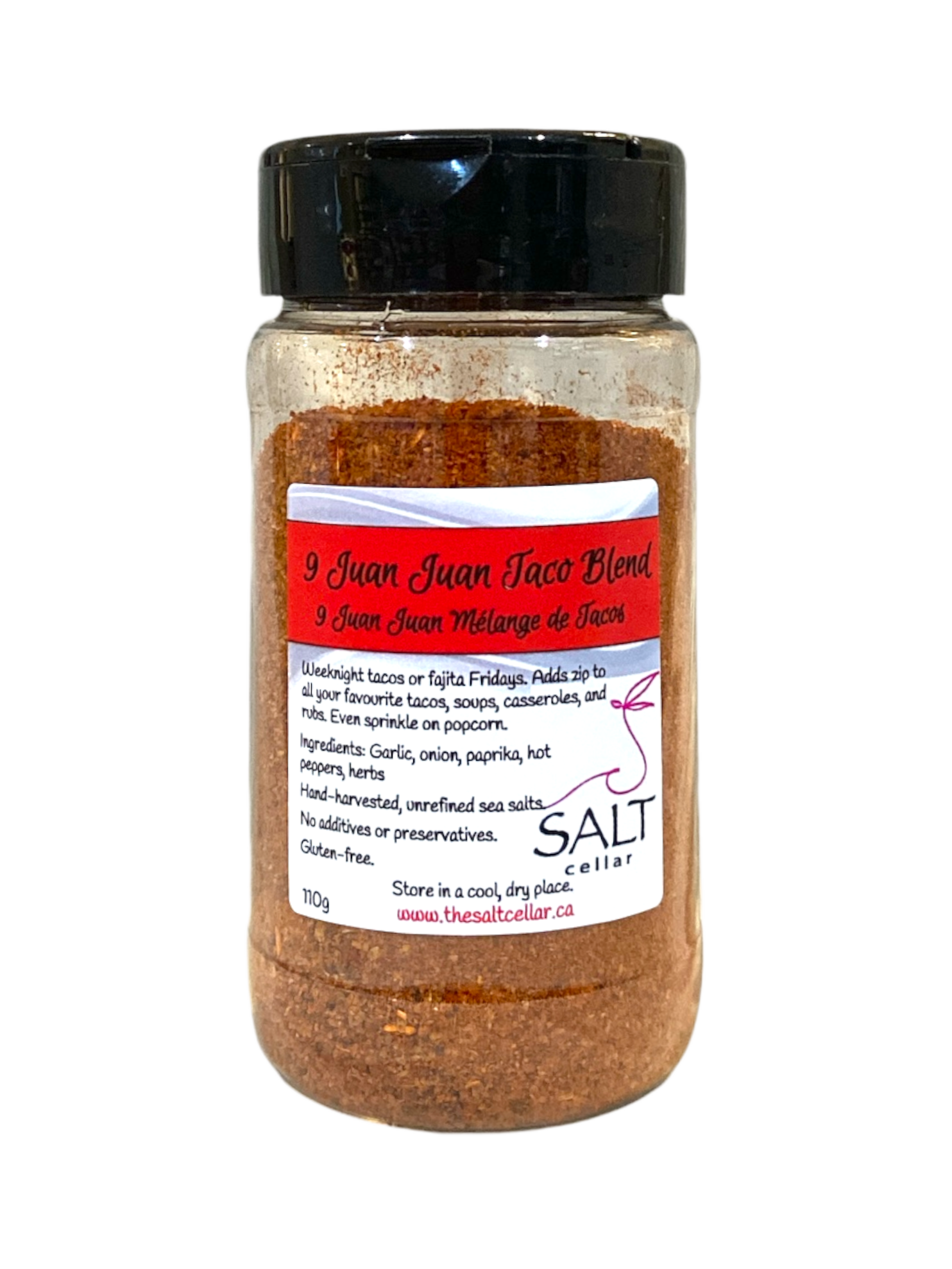 Experience a burst of heat and flavor with 9 Juan Juan Taco Blend. Handcrafted with sea salt, spicy chilies, garlic, onion, and spices, this blend offers a perfect balance of heat and kick. Elevate your taco game with this flavorful addition.