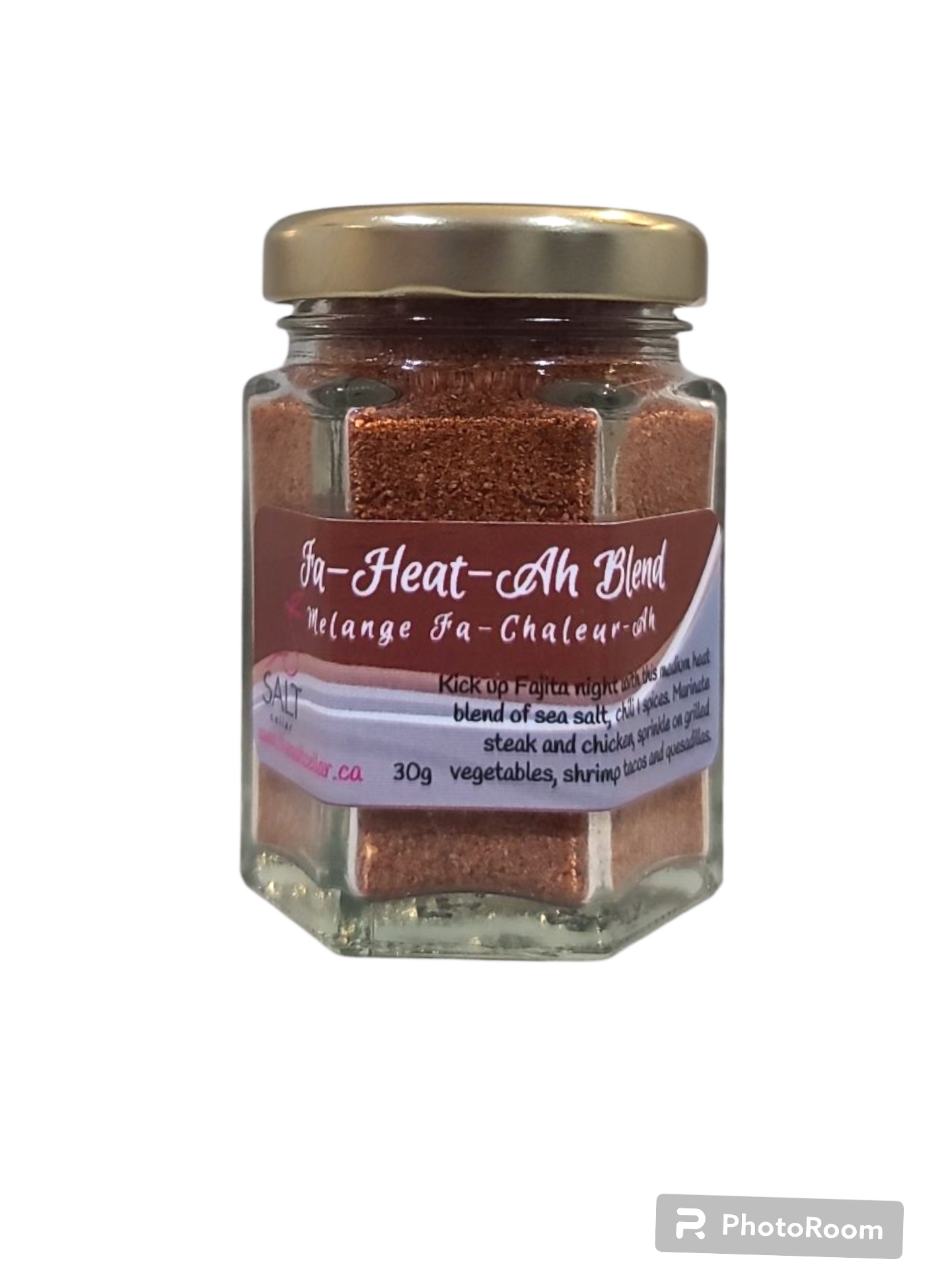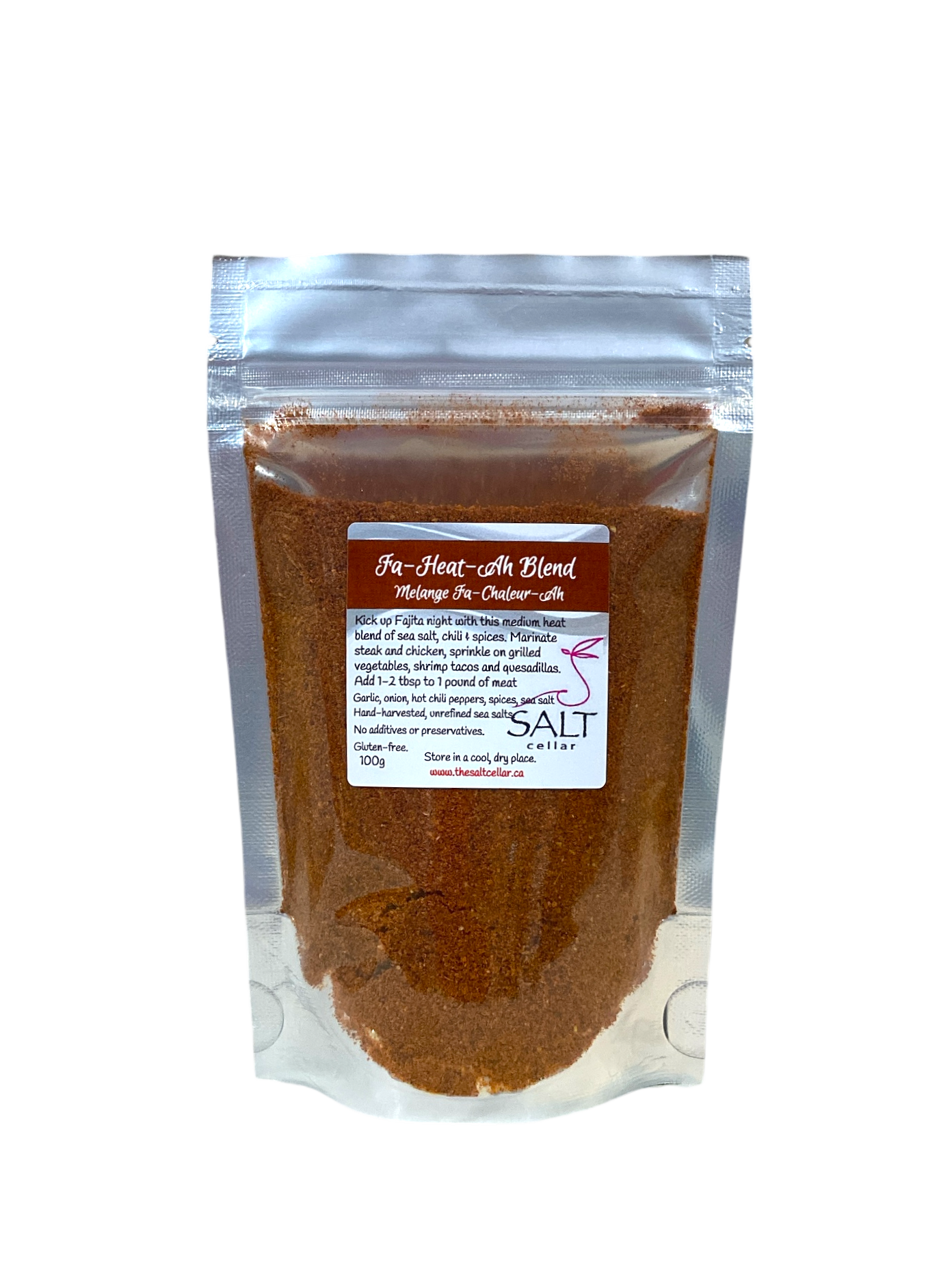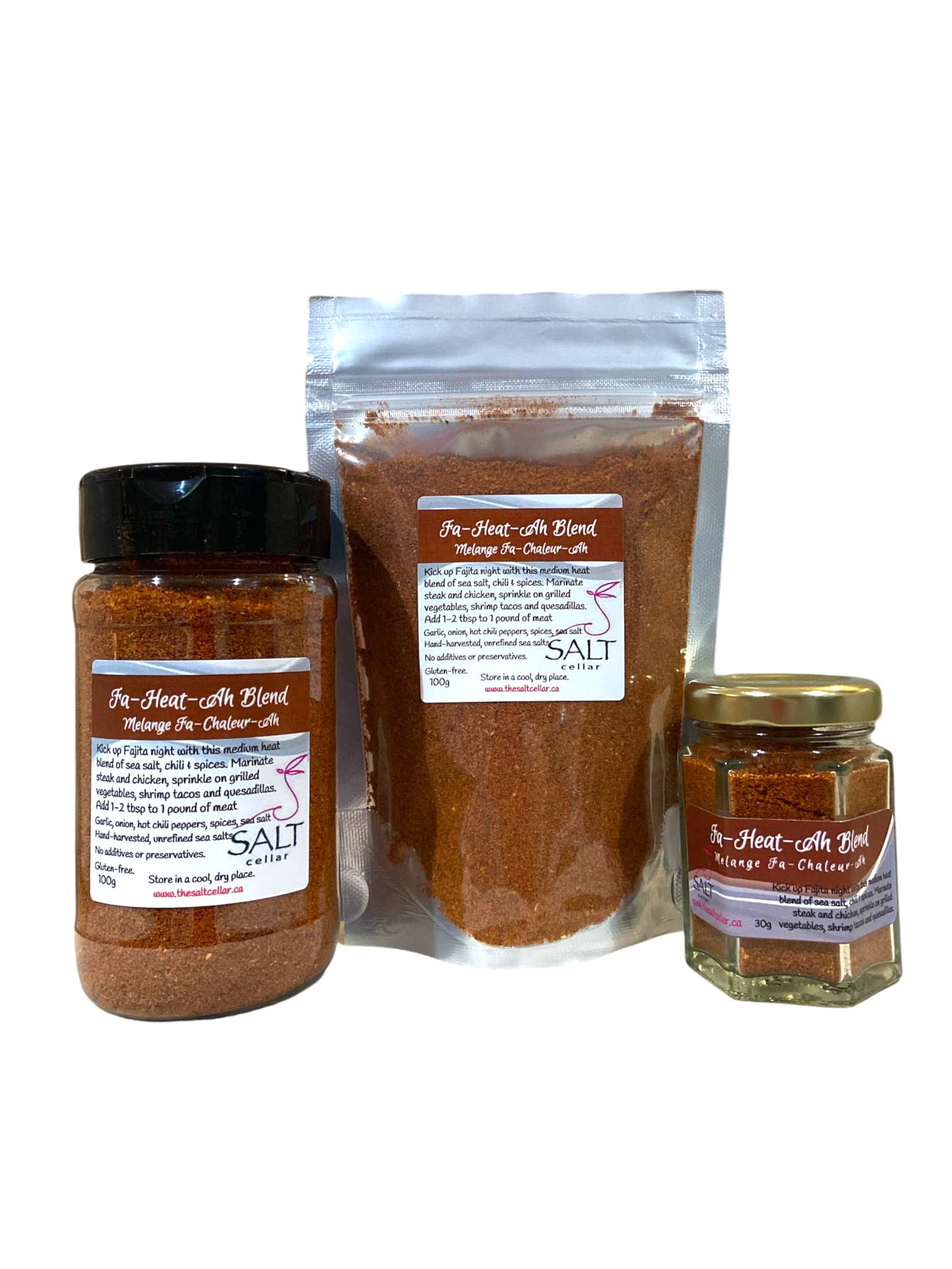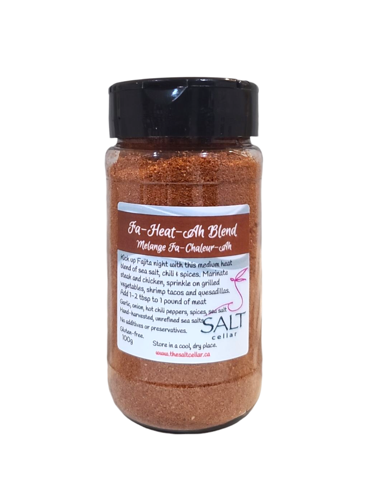 Enhance your Fajita night with our LOW SODIUM Fa-Heat-Ah Blend. This seasoning, consisting of sea salt, chilies, and spices, will add the perfect touch of medium heat to your dishes for an authentic flavor.