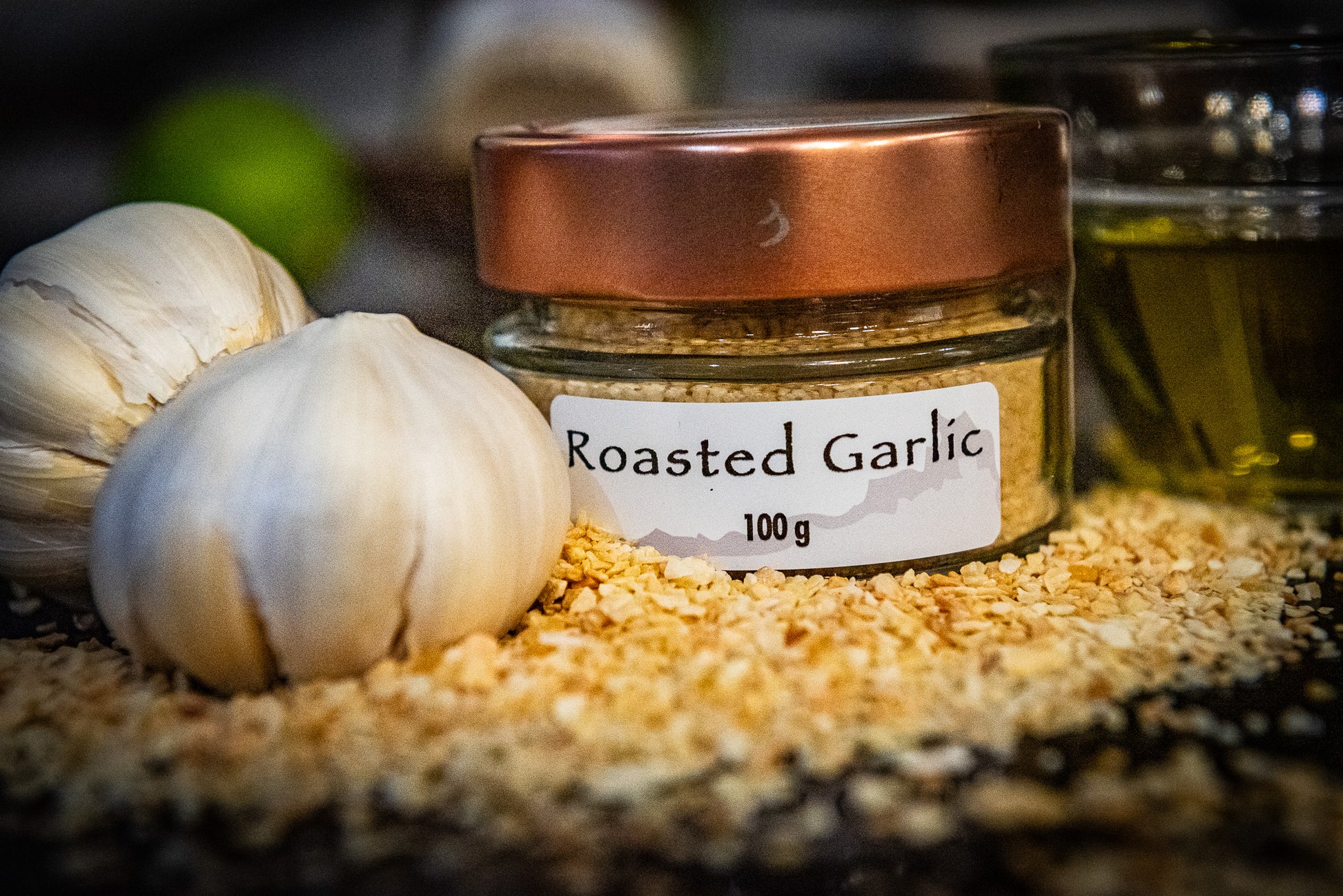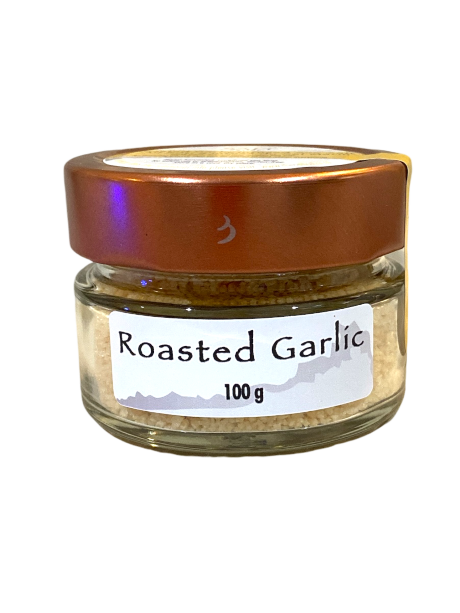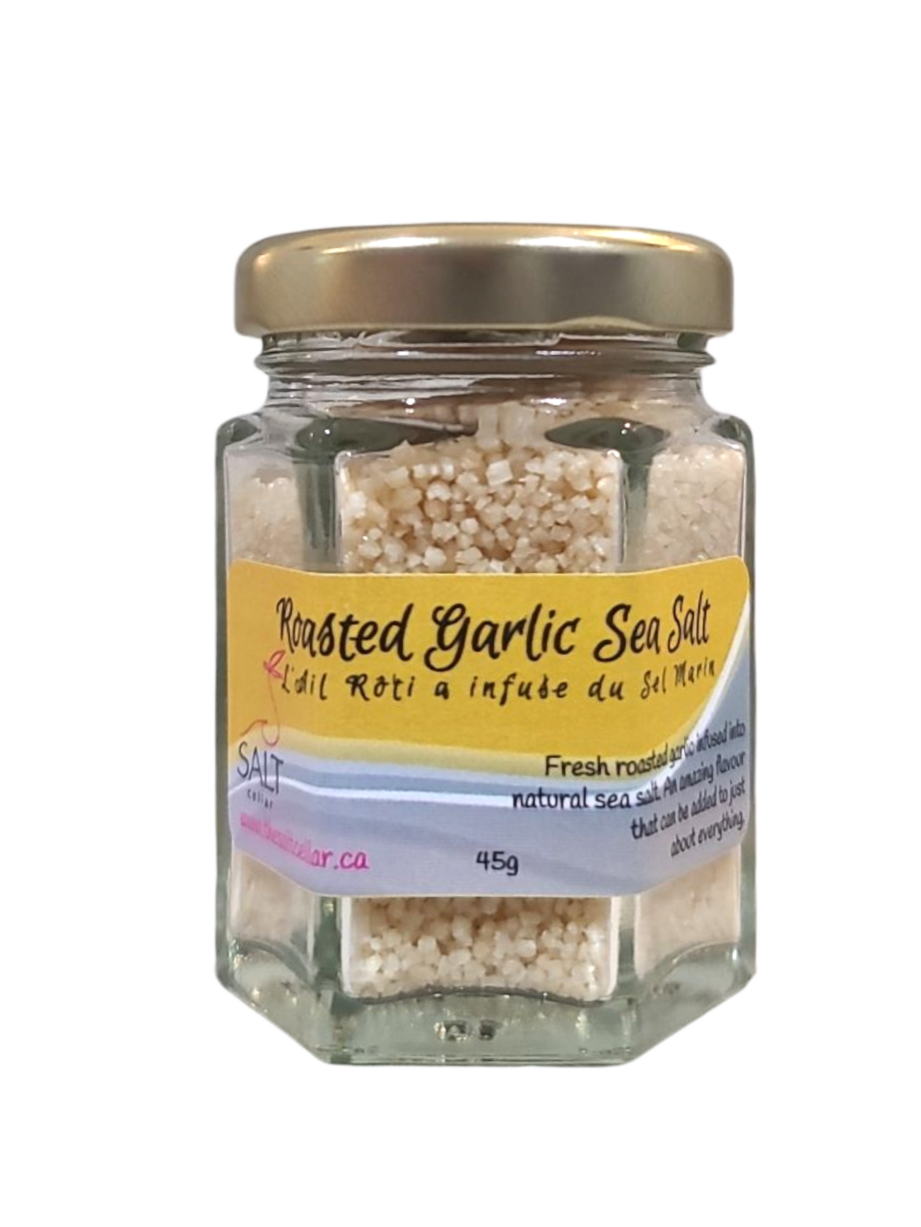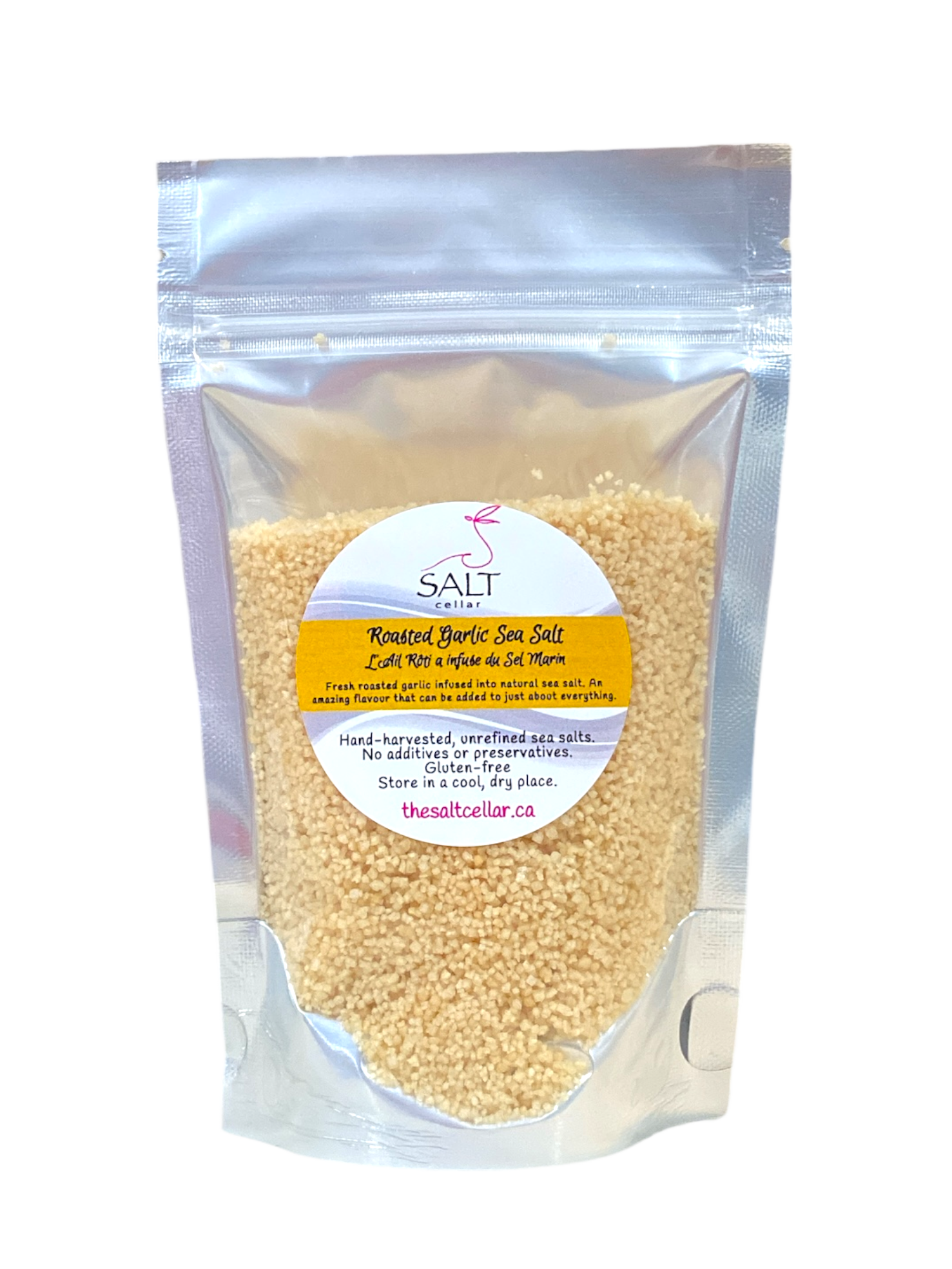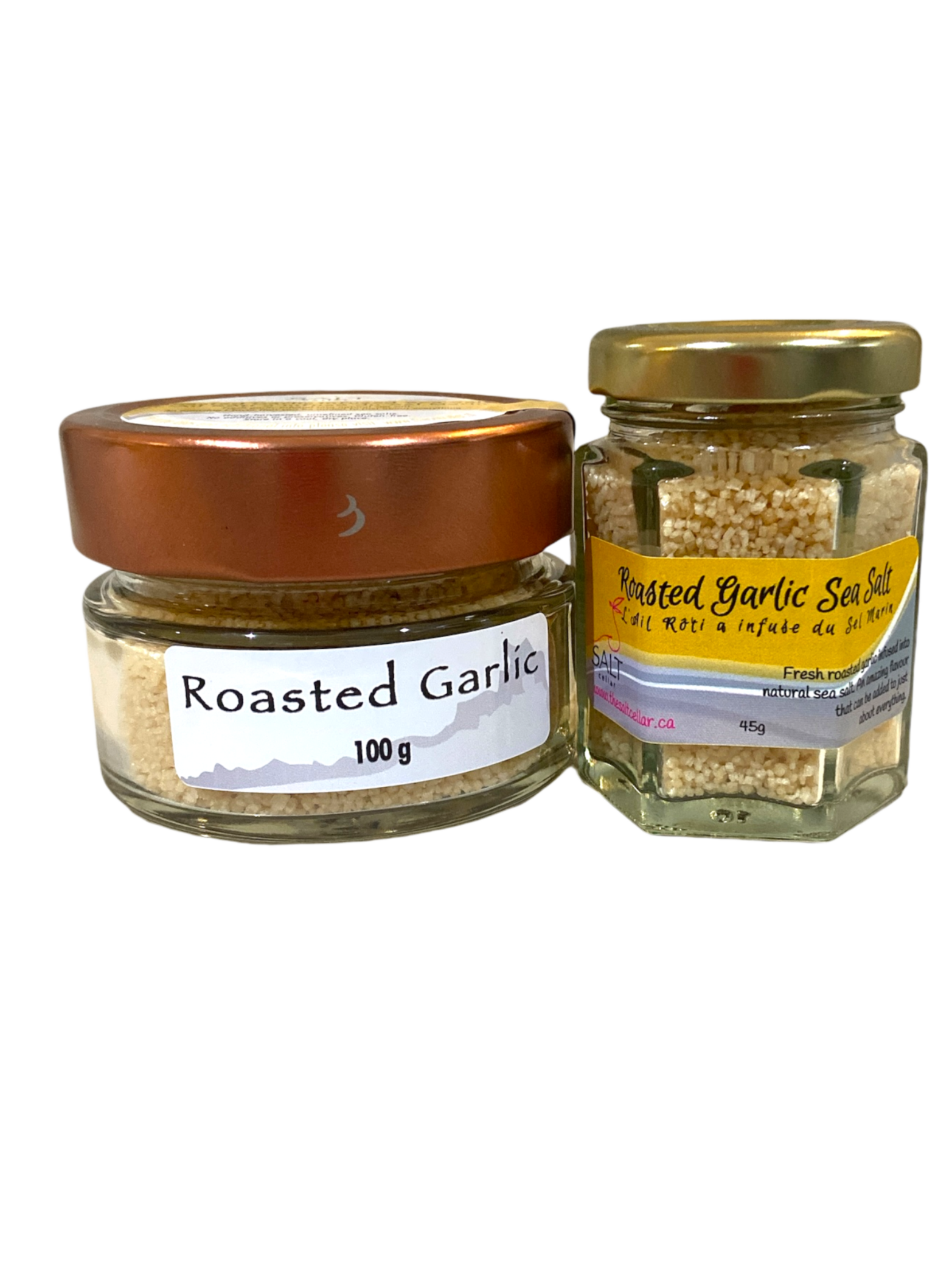 Roasted Garlic is sea salt infused with real garlic. Courser than a store bought garlic salt, this delicious sea salt is 100% natural making it a healthier alternative than the store bought version. Eliminate the need to mince garlic and sprinkle this beautiful salt on eggs, pastas, veggies, and really any dish screaming for garlic flavour. Try on absolutely everything!
